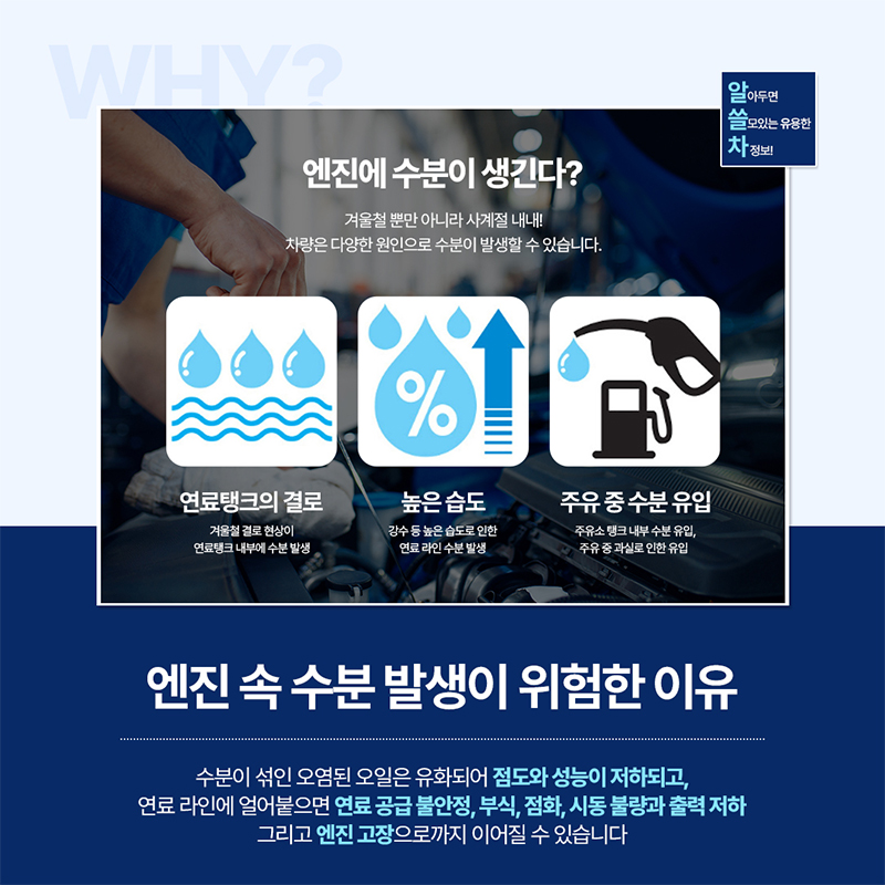 엔진 내부에 쌓인 수분을 방치할 경우 차량 운행에 여러 문제를 일으킬 수 있습니다.
