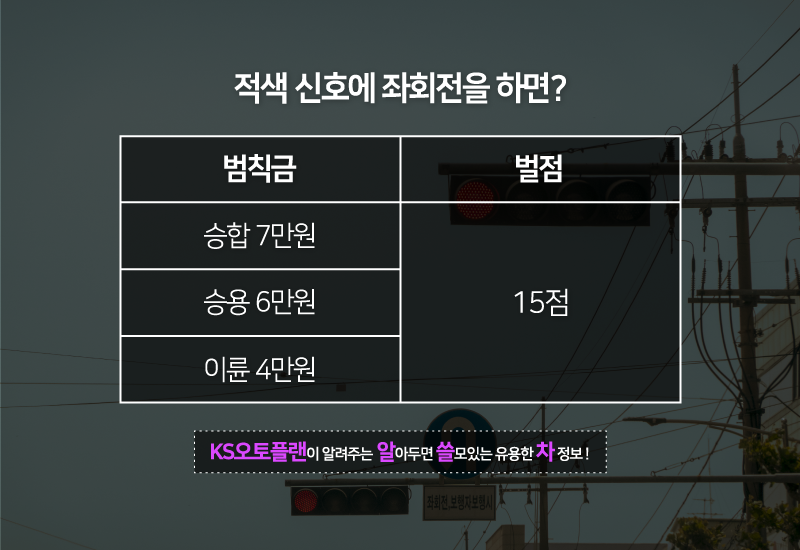 적발시 - 벌점 15점과 함께 승합차 7만원 / 승용차 6만원 / 이륜차 4만원의